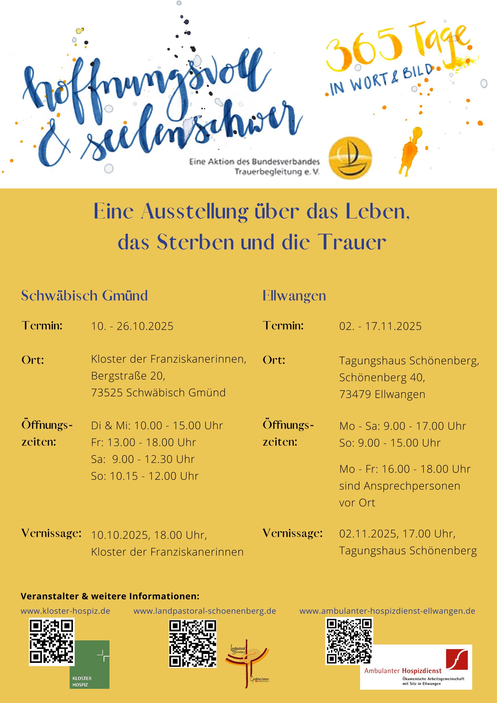 Der Bundesverband für Trauerbegleitung hat Menschen eingeladen, ihre Gefühle und Ressourcen in der Trauer sichtbar zu machen. In Texten, Bildern oder anderen kreativen Ausdrucksformen ist so diese Wanderausstellung entstanden, die wir in Schwäbisch Gmünd und Ellwangen zeigen.